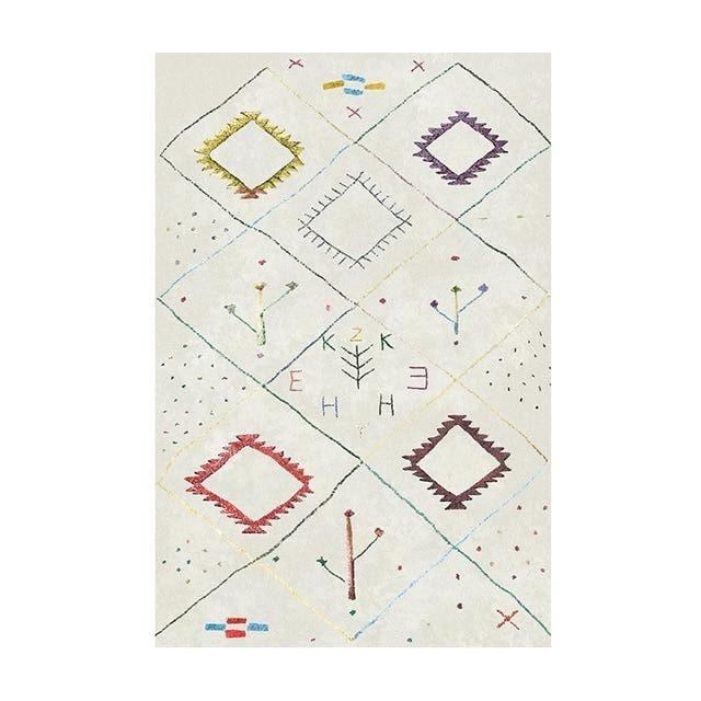 To, co wyróżnia nasz dywan, to jego niepowtarzalny wzór inspirowany symboliką berberyjską, ale przedstawiony w lekkiej i współczesnej formie. Każdy kolorowy akcent, od subtelnych linii po geometryczne kształty przypominające litery czy proste symbole, wydaje się być narysowany odręcznie, co nadaje dywanowi autentycznego, artystycznego charakteru. Biała lub kremowa baza sprawia, że dywan jest niezwykle wszechstronny i pasuje do wielu stylów wnętrzarskich, od minimalistycznych po bardziej eklektyczne. Delikatne odcienie czerwieni, błękitu, zieleni, fioletu, żółci i czerni rozmieszczone na jego powierzchni dodają głębi i dynamiki, nie przytłaczając jednocześnie przestrzeni. Jest to idealne połączenie tradycyjnego rzemiosła z nowoczesnym wzornictwem, które sprawi, że Twój dom będzie wyglądał świeżo i oryginalnie.